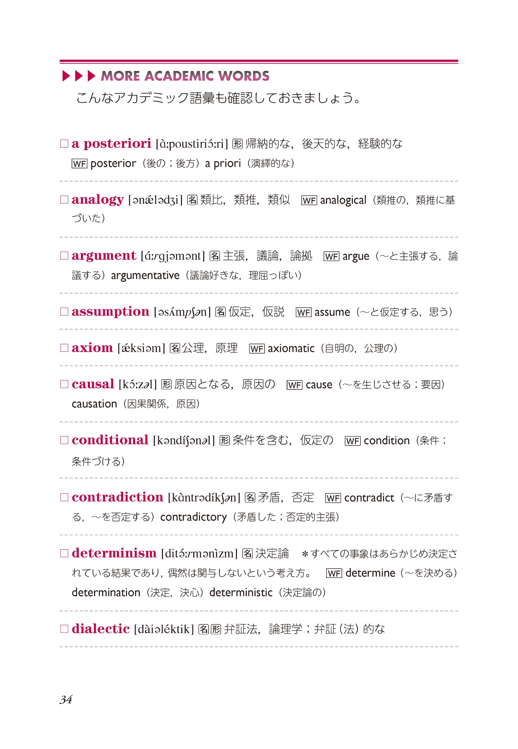 繰り返しになりますが,本書はまずTOEFL®TEST のスコアアップに役立ちます。次に,国内の大学で基礎教育カリキュラムを英語で学ぶうえでもきわめて有効です。本書で学ぶ語彙,表現はTOEFL®TEST 対策にとどまらず,学問研究全般へとみなさんの視野を広げ,さらには無限の知識空間へと案内してくれるでしょう。幸運を祈ります。