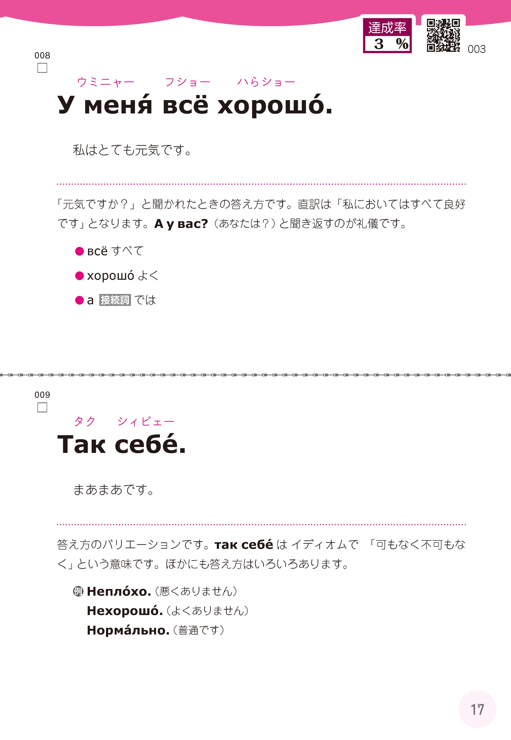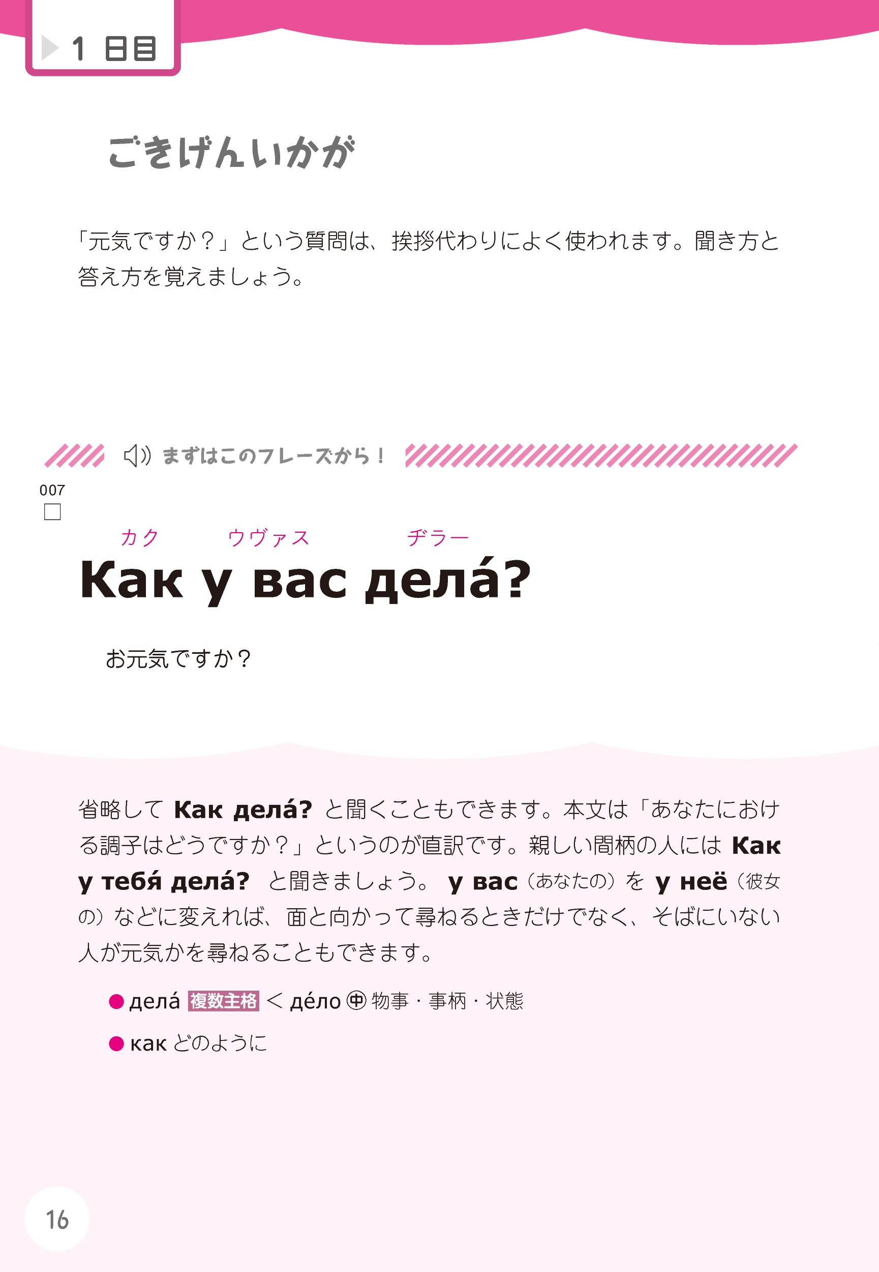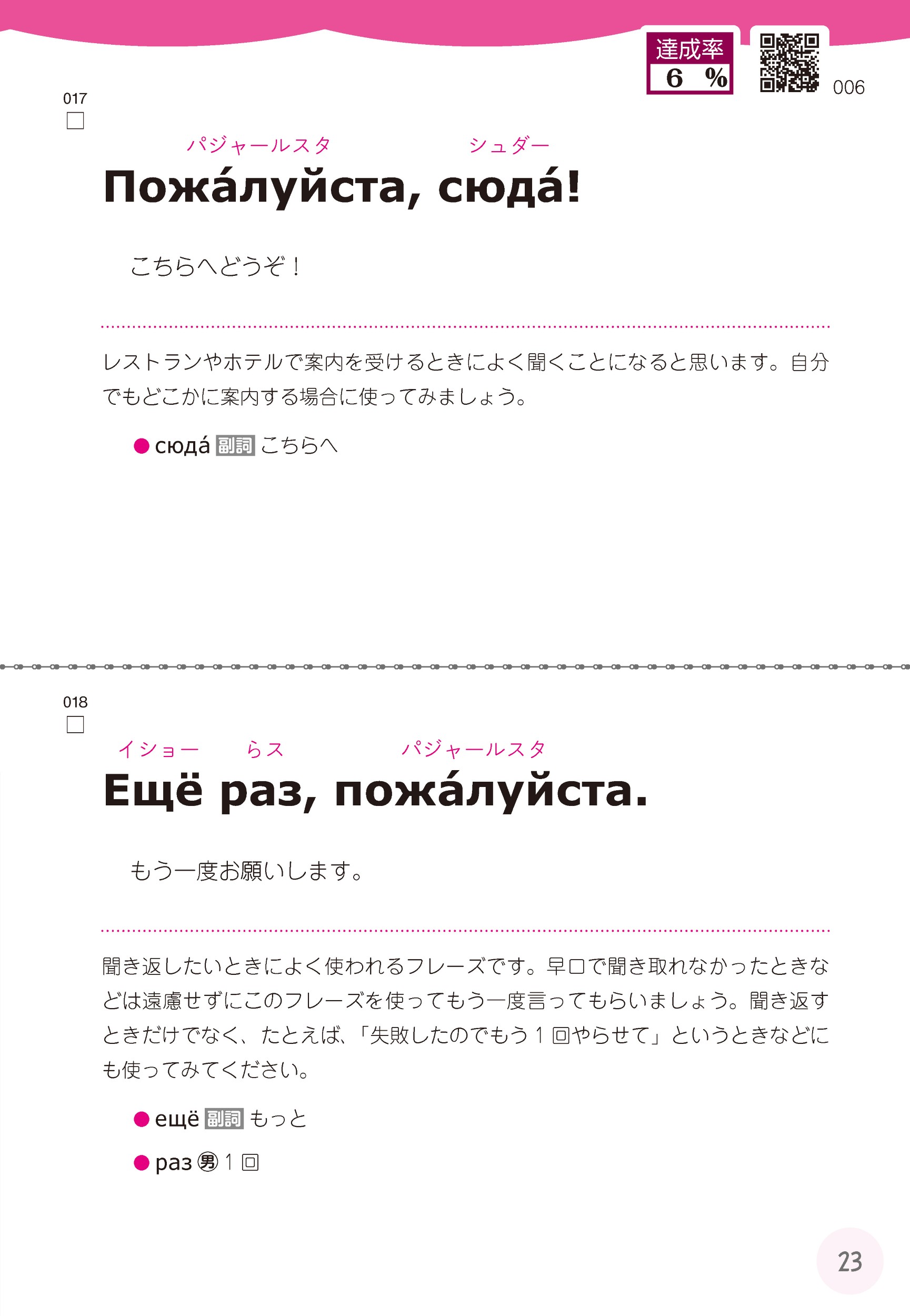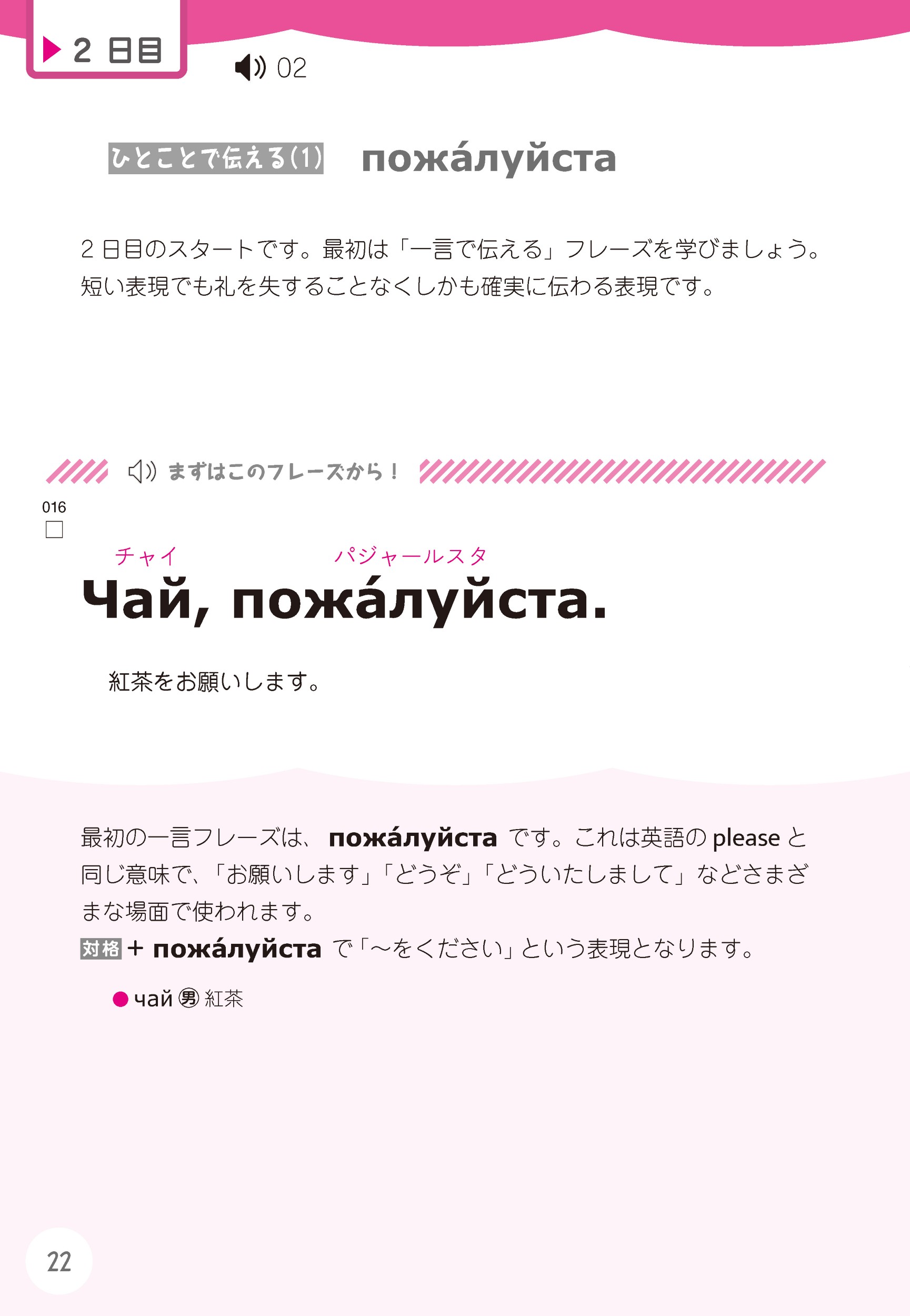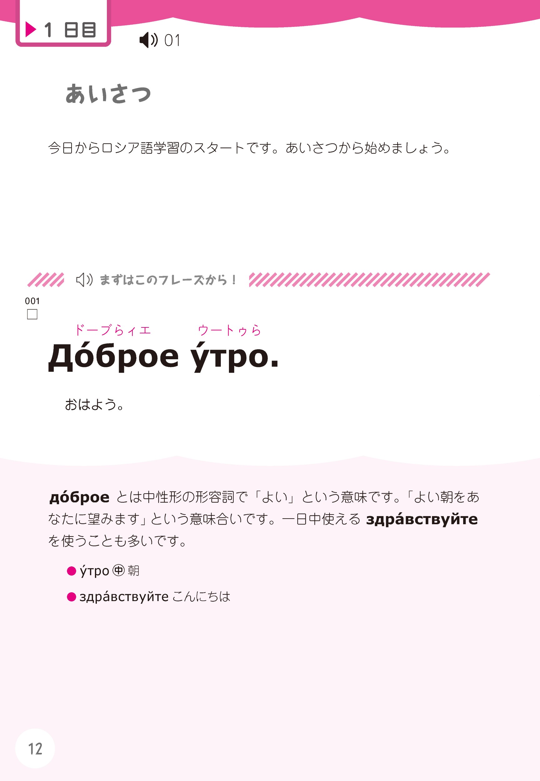 このたび、約1 か月でスケジュールを立てながらロシア語の基本フレーズを学べる参考書をつくることができました。ロシア出身のオリガ・タラリキナ先生にアドヴァイスして頂き、日常的にネィティブの方がよく使う自然な表現を300 フレーズ厳選しました。初めて学習する方でも手軽に短いフレーズを暗記して、会話に役立てていただけます。どんな場面で使われるか説明をつけさせていただきました。また、文法が学べるフレーズも作成しました。