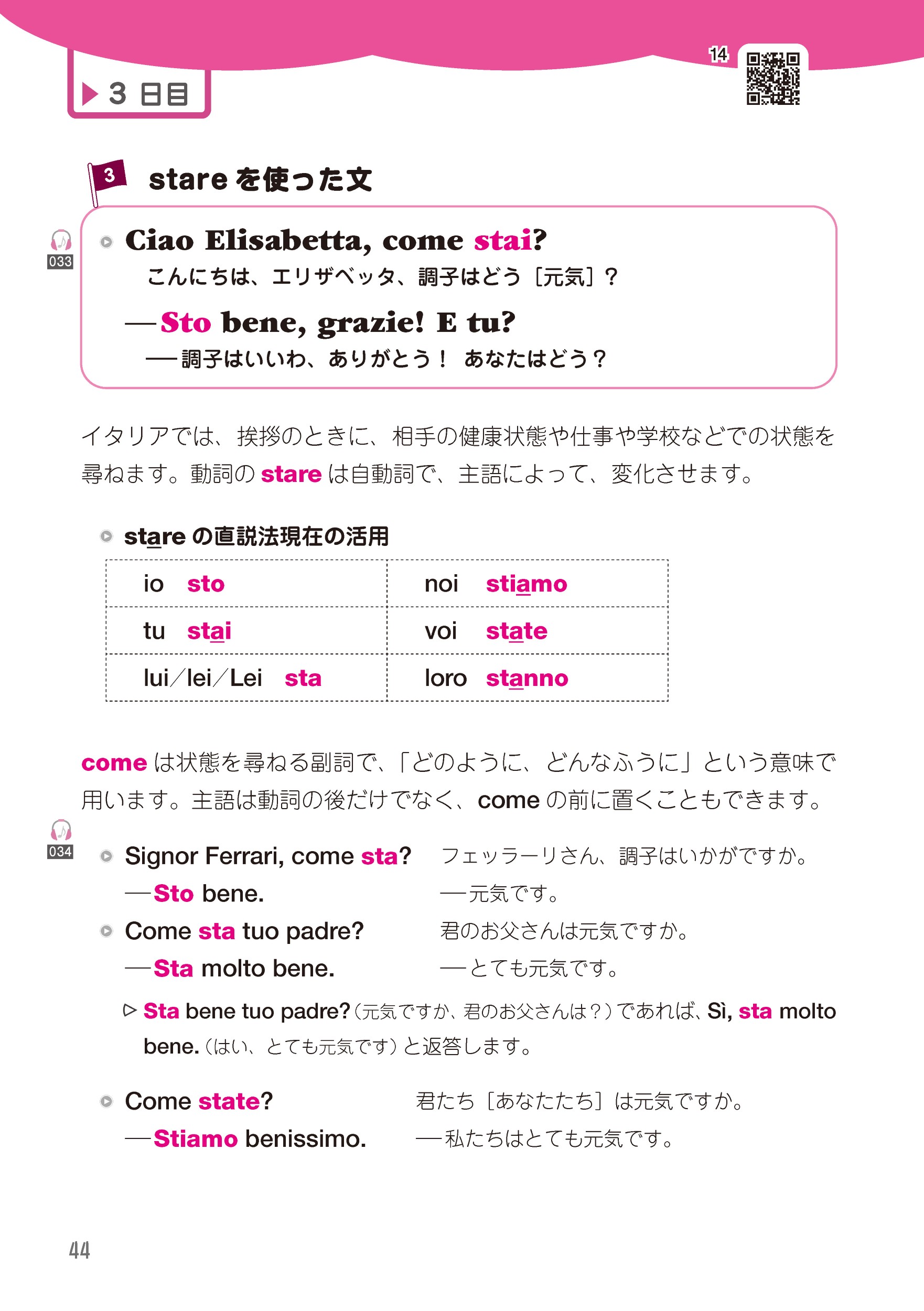 イタリア語の基礎文法を学び直すために,解説と例文をコンパクトにまとめました。平日5日×4週間=20日間の構成(各週とも1~4日目「文法」,5日目に「週のまとめの練習問題」)。例文の音声はQRコードからの再生に加えて音声無料ダウンロードとスマホで便利な「すぐ聴く音声」にも対応しています。
