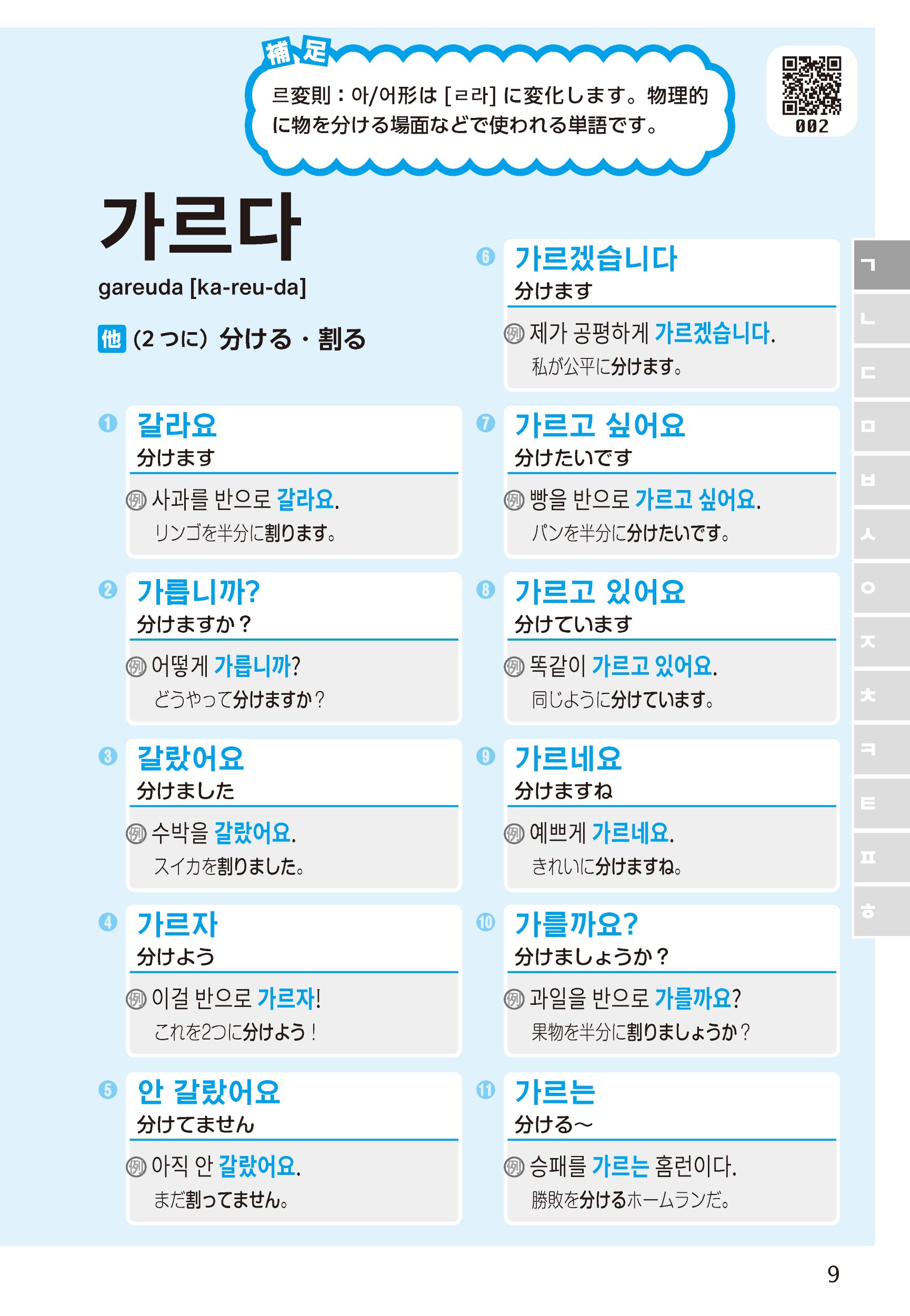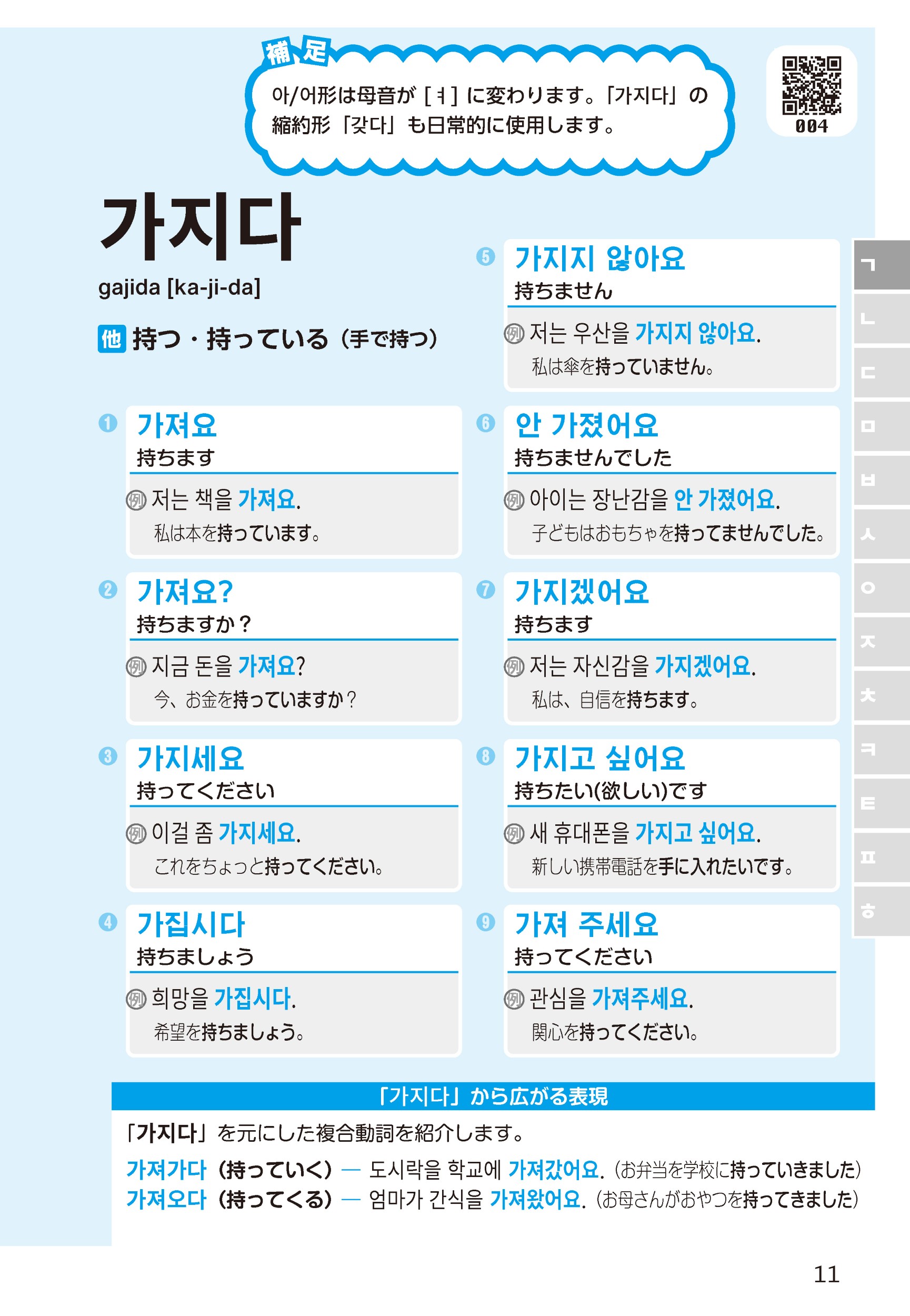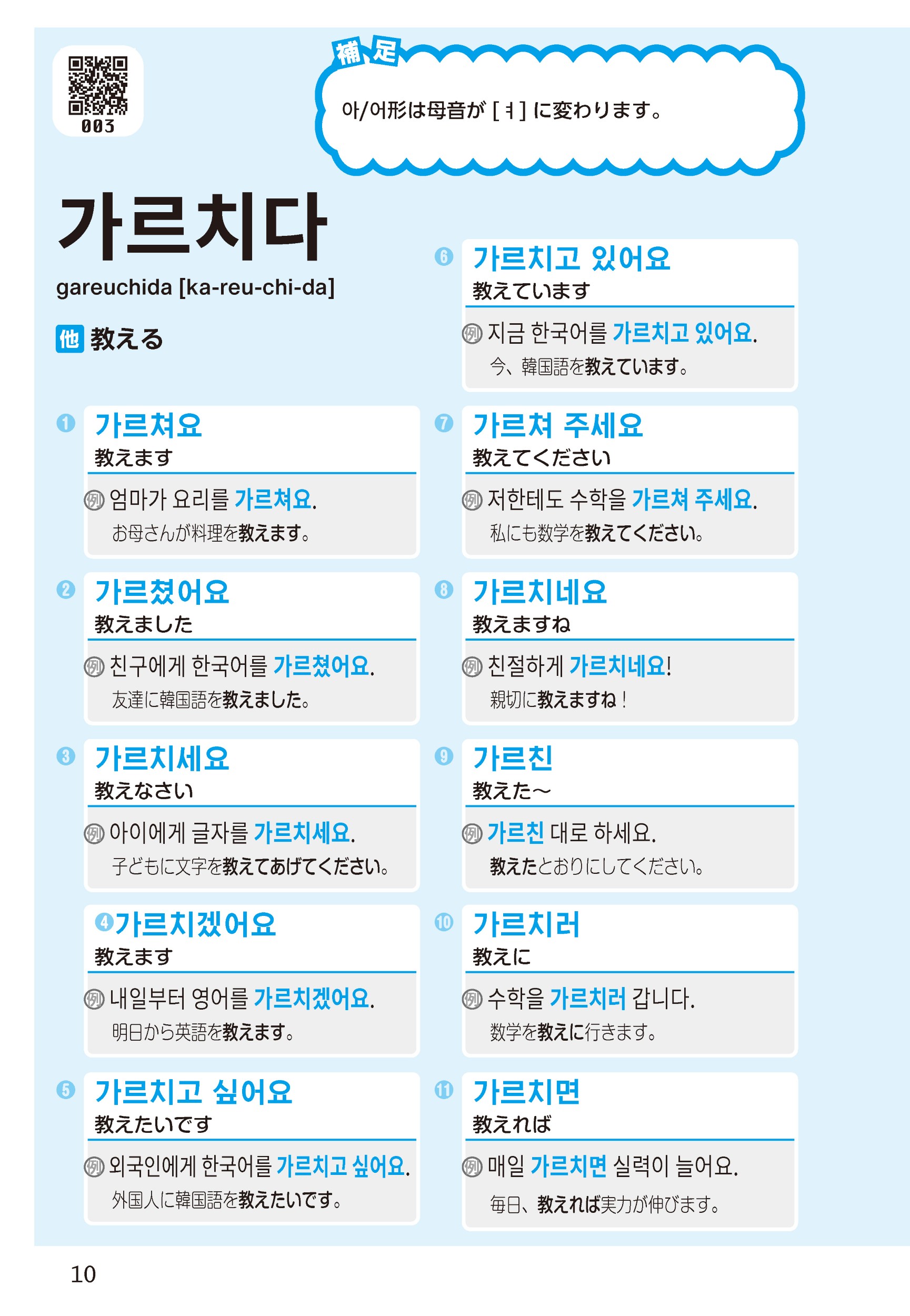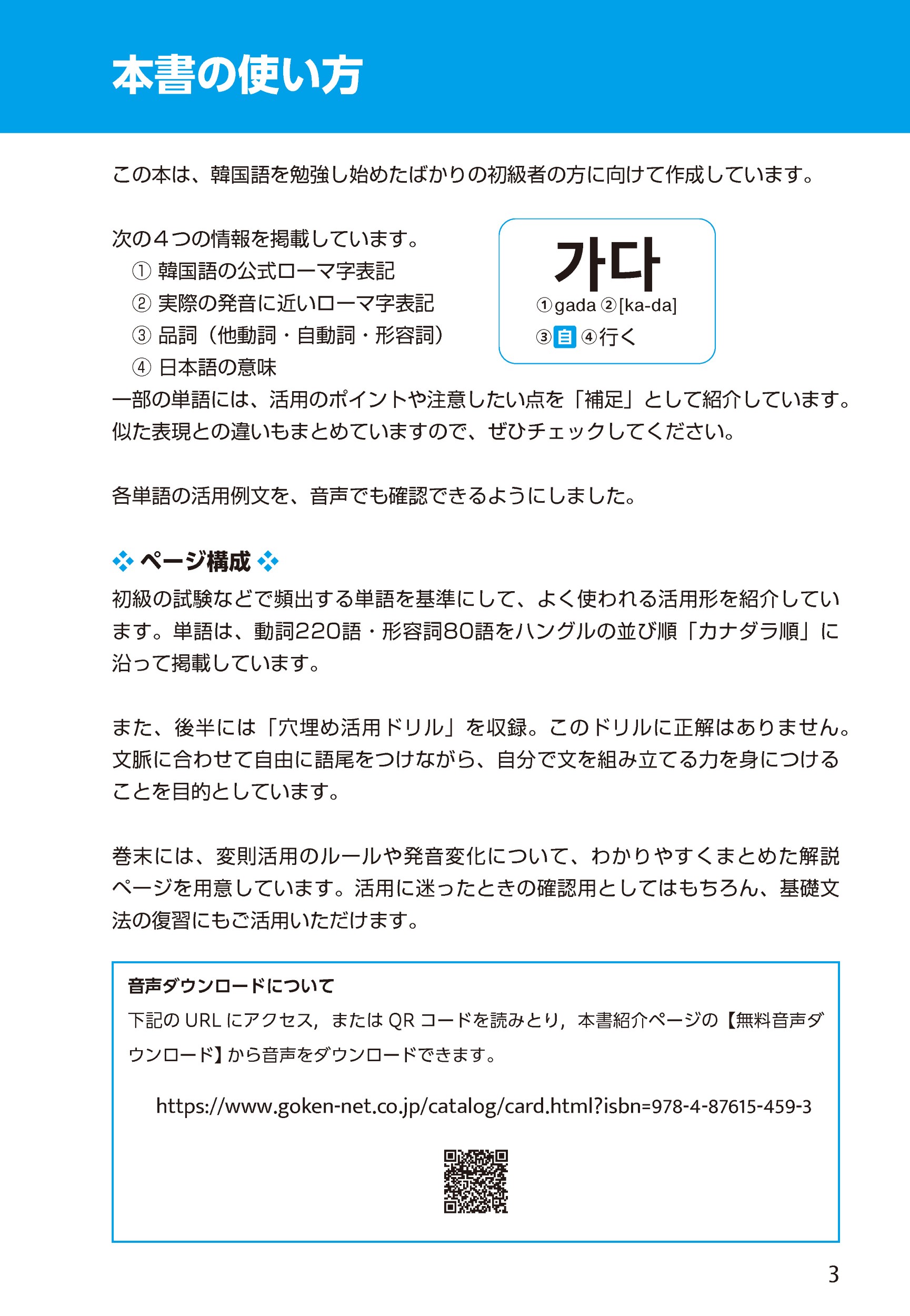 この本は、私と同じように動詞と形容詞の活用が「覚えられない!」「苦手意識がある」という方に向けて作りました。また、活用を覚えても、「発音が合っているのか自信がない」と、韓国語を口に出すことをためらってしまう方も多いと思います。そんな方のために、例文の音声も収録しました。
