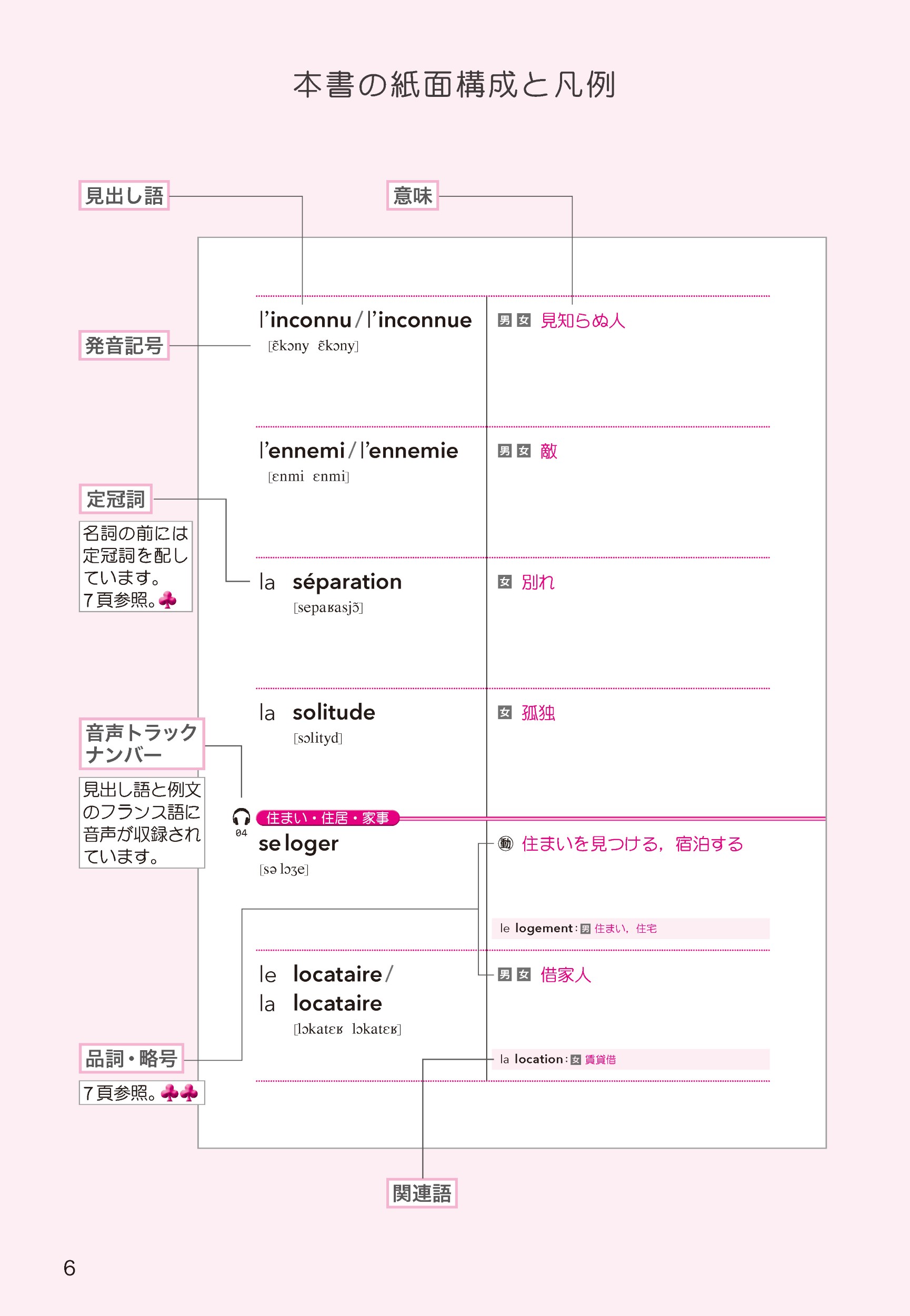 記憶の定着のためには,その単語を何度も目にすることが大切です。「この単語,前にも見たことある!」と思い出せれば,その単語がほぼ身についていると言っても言い過ぎではありません。そのため本書では,仏検 3 級までの単語をできる限り例文の中で用いました。また見出しの単語のいくつかは,場所を隔てて,違う例文の中に現れるように工夫しています。