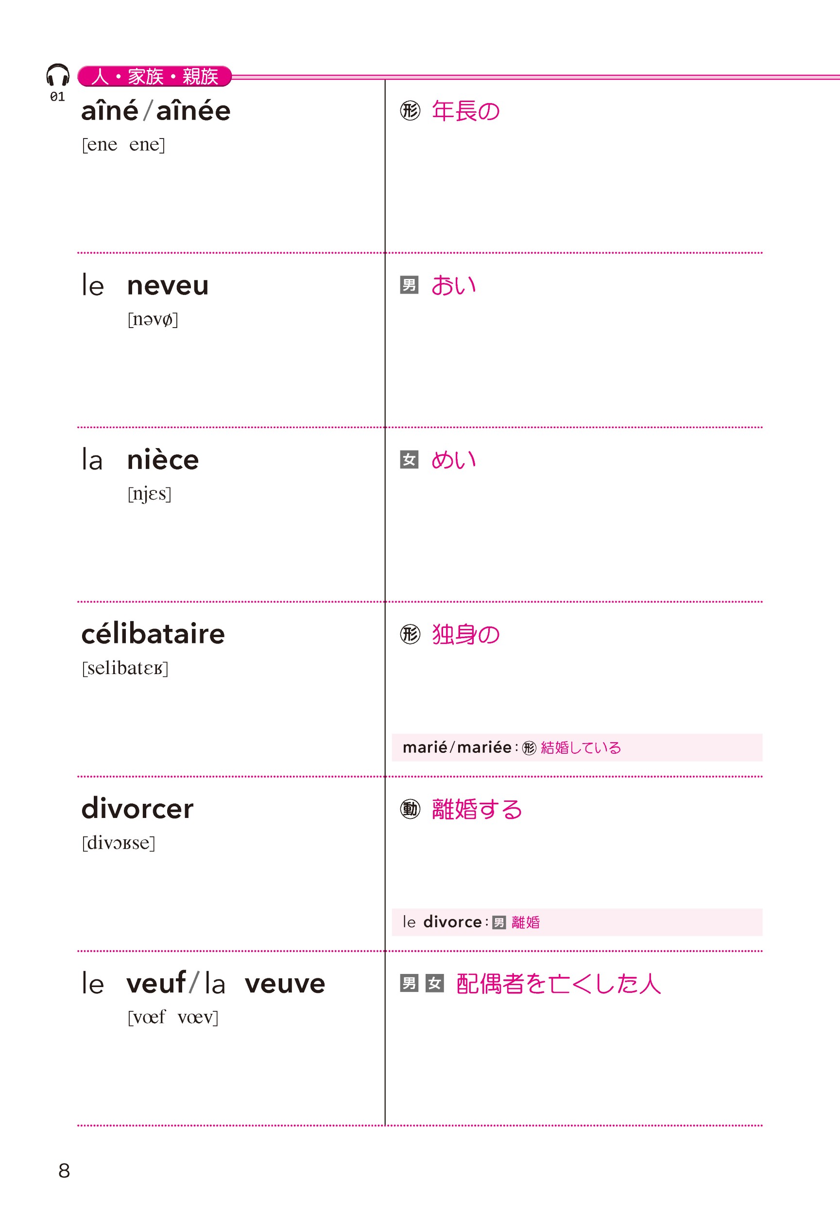 すべての見出し語は場面や情景がイメージしやすい例文つきです。見出し語のいくつかは別の例文中にも登場するよう工夫し,語彙が定着しやすくなるようにしました。また,同シリーズの3級までに掲載した単語をできる限り例文中に用いているため,基礎を固めながら「一歩進んだフランス語」へステップアップしていけます。