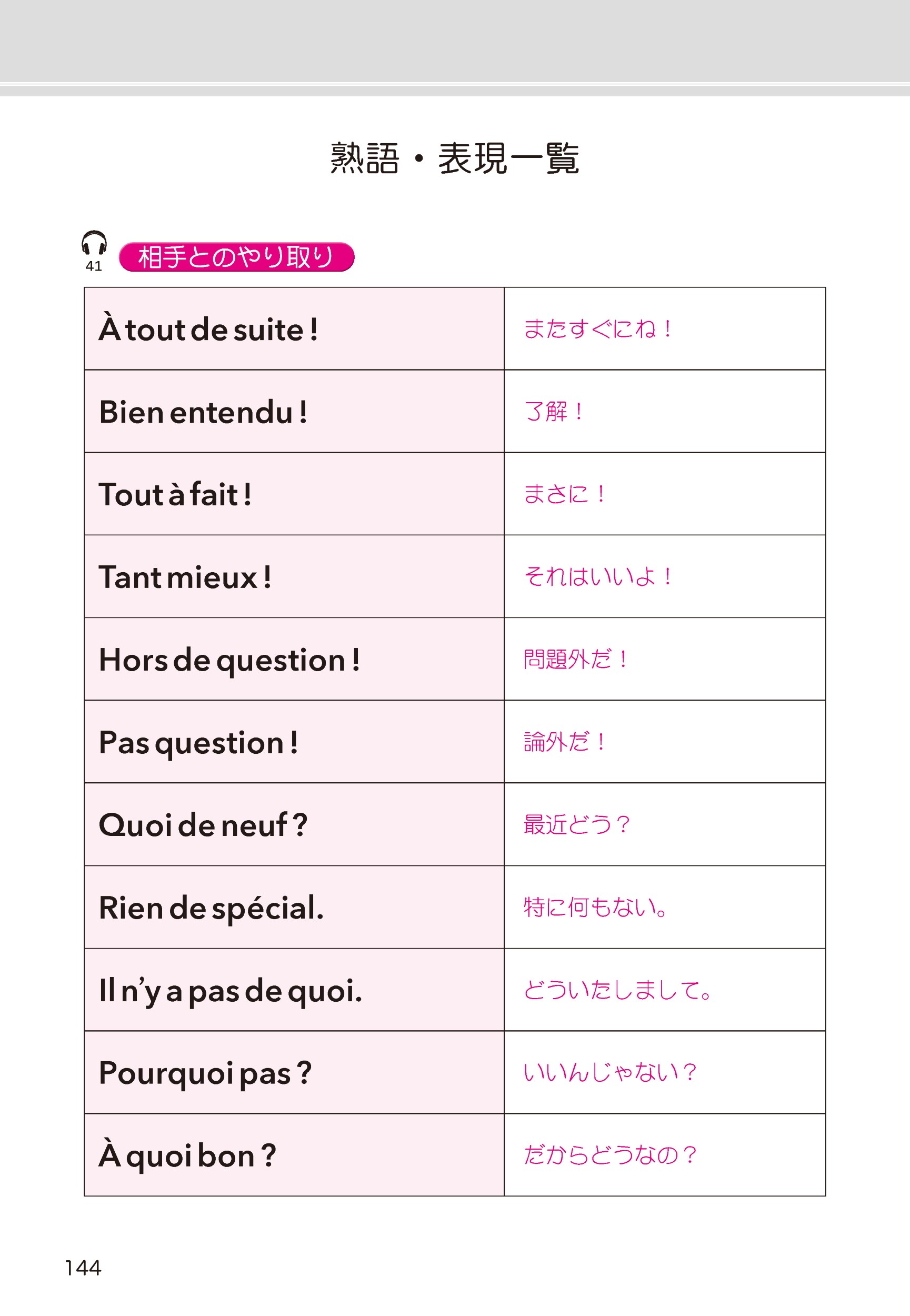 最後になりましたが,フランス語の例文をチェックしてくださった Frank Michelin 先生には心から感謝いたします。例文をひとつひとつ吟味し,「自然な言い回し」になるよう細心の注意をはらってくださいました。録音を担当された,クレール・ルヌール先生,ジョルジュ・ヴェスィエール先生には,話し手の気持ちがより伝わるよう,細やかなニュアンスまでご配慮いただきました。編集を担当された宮崎喜子氏には,単語の選定からレイアウトに至るまで,常に適切なご提案をしていただきました。宮崎さんの伴走なしには,決してゴールまで辿り着きませんでした。この場をお借りして深くお礼申し上げます。