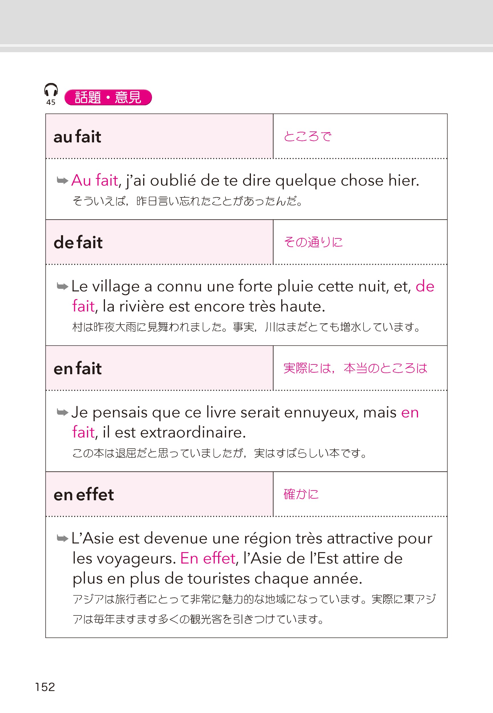 仏検準 2 級のレベルは「一歩進んだフランス語」と設定されています。3級までの基礎を網羅しつつ,日常生活で使われる表現をさらに増やすこと,またある程度の長さの文章を理解できることが求められます。そのため本書においても,「文は 1つ」をあくまで基本としながらも,単語によっては,文を 2 つにして,表現の幅を広げ,少し長めの文にチャレンジできるようにしています。さらに巻末には熟語表現をまとめてあります。こちらもぜひ活用してください。
