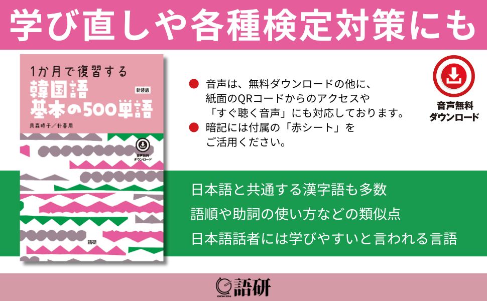 日本語と共通する漢字語も多数で語順や助詞の使い方などの類似点も多く日本語話者には学びやすいと言われる韓国語。思い切って始めてみた方にも思い切って始めてみたい方にも取り組みやすい分量の単語集です。音声無料ダウンロード。『1か月で復習する韓国語基本の500単語[新装版]』