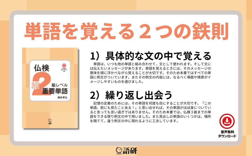 次の高みをめざす方に『仏検準2級レベル重要単語』刊行です。単語を覚えるための「具体的な文の中で覚える」・「繰り返し出会う」という2つの鉄則を軸に据え、5級4級3級とこれまでに学んだ語彙の土台に重ねて積み上げる単語集です。音声無料ダウンロード。『仏検準2級レベル重要単語』國枝 孝弘:著 ISBN:978-4-87615-460-9定価:本体価格2000円+税新刊2026-01-26