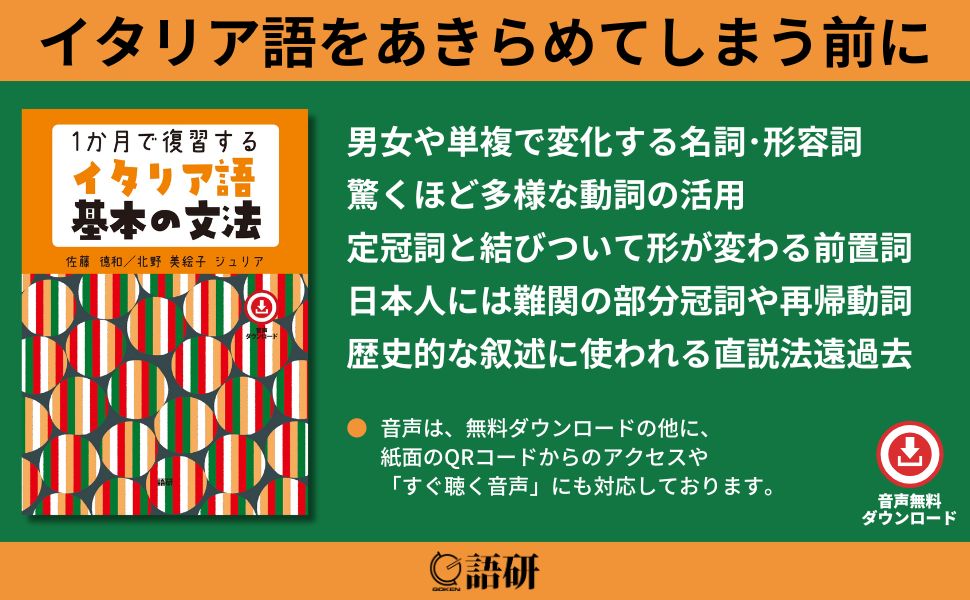 イタリア語の学習を再開したいと考えている方を主な対象とした一冊。特に、日本人学習者にとって難しいとされる部分冠詞や再帰動詞については、詳しく解説しています。初級者から中級者まで。音声無料ダウンロードだけでなくスマホで便利な「すぐ聴く音声」もご利用いただけます。『1か月で復習するイタリア語基本の文法』